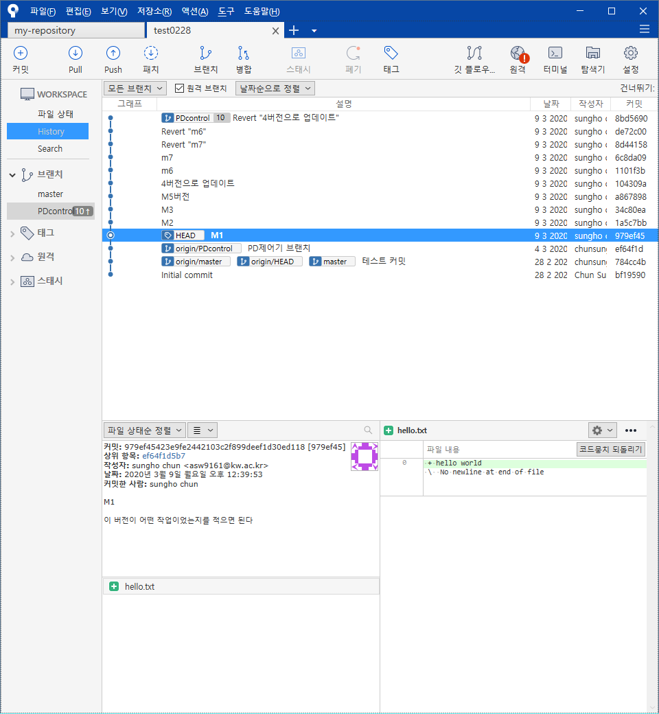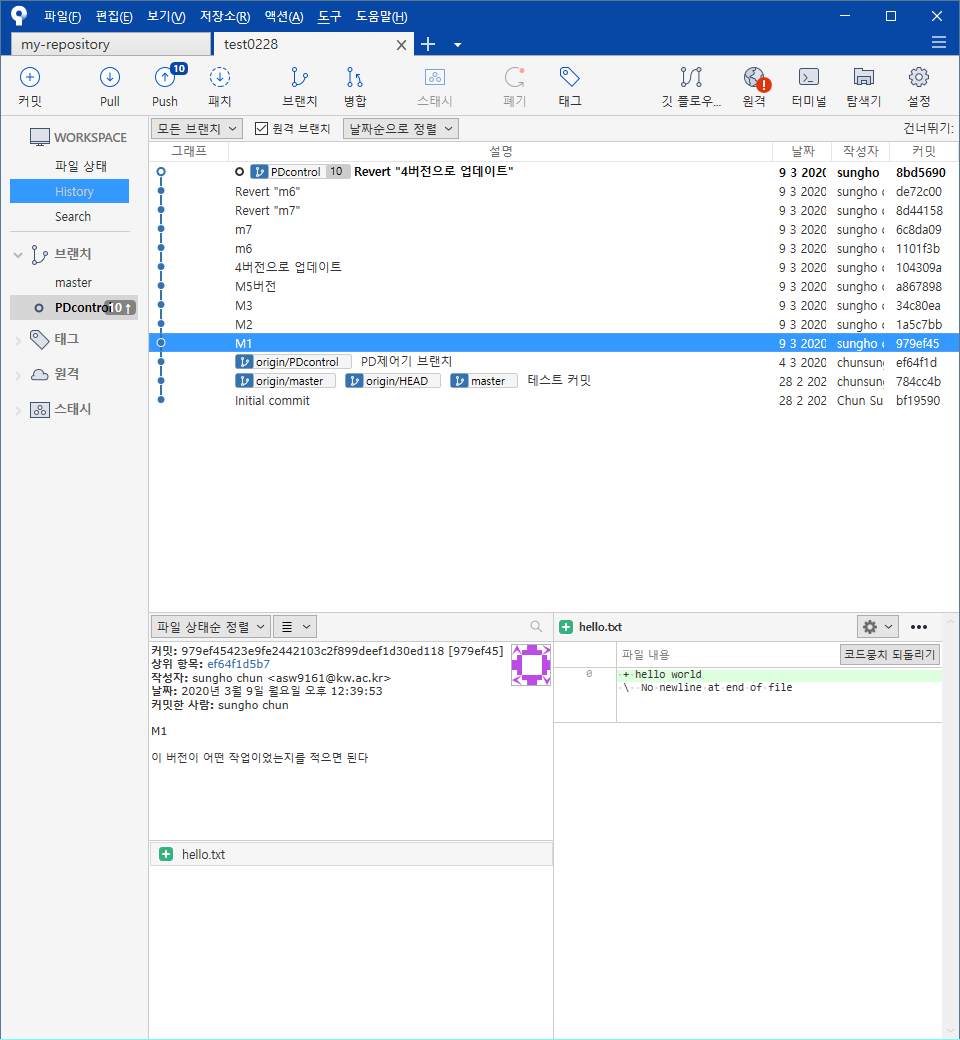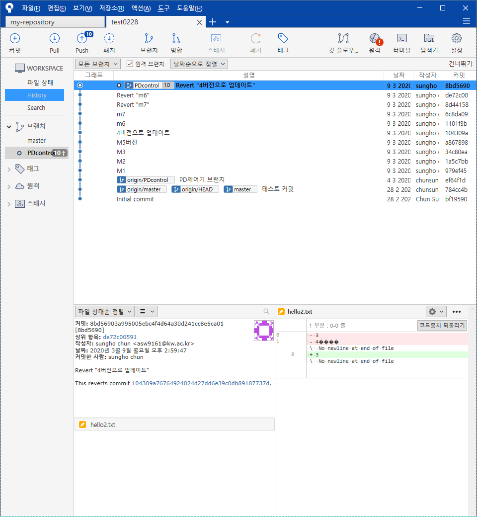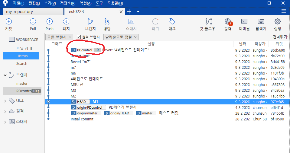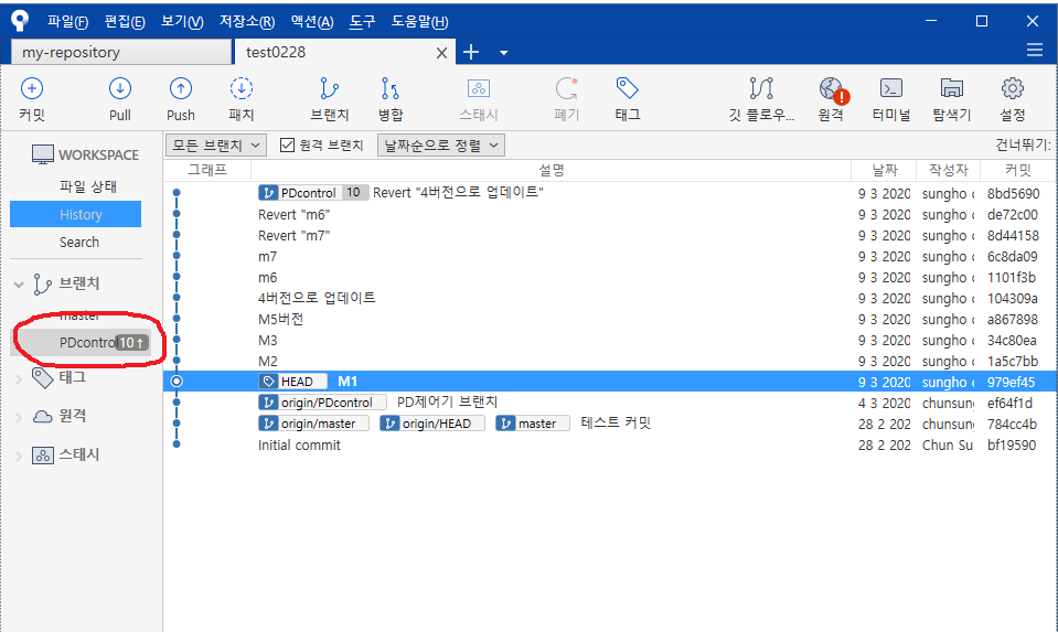 가장 최신 브랜치의 이름이 PDcontrol 인것을 볼 수 있다. 그렇다면