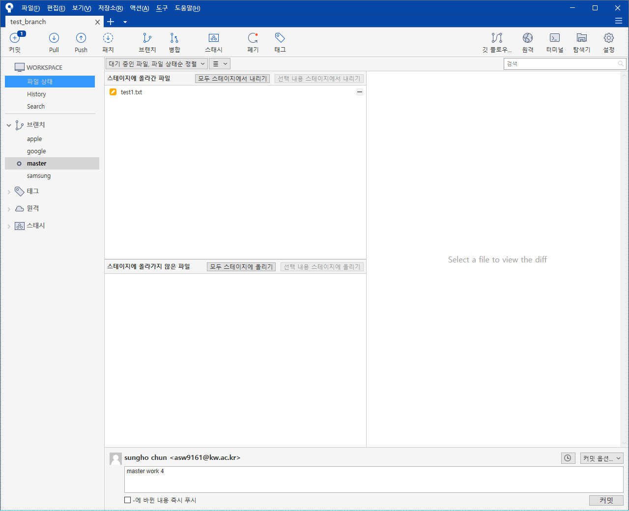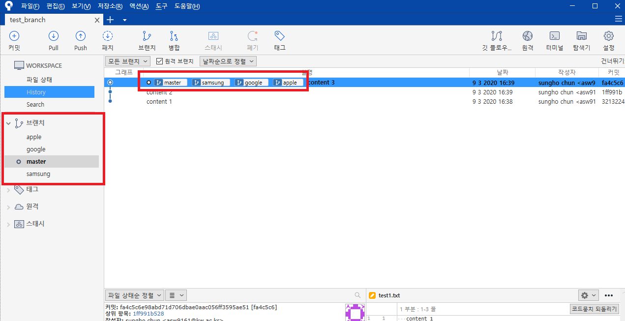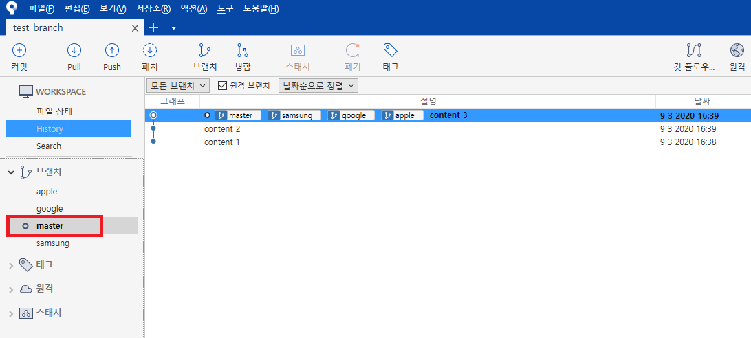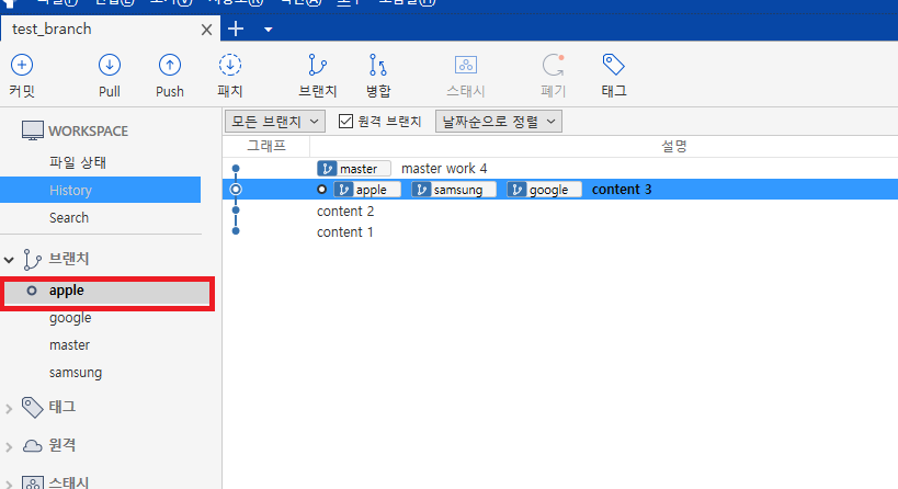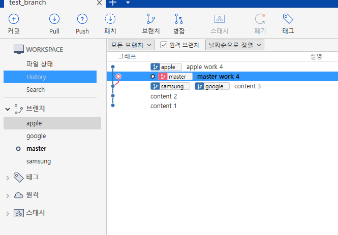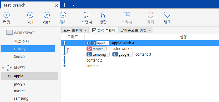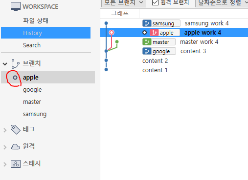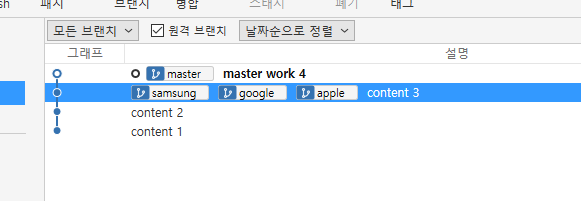 위 사진은 apple, google, samsung 이라는 3개의 브랜치를 하고 난 후 사진이다.