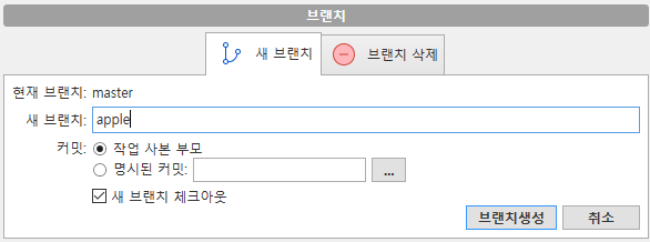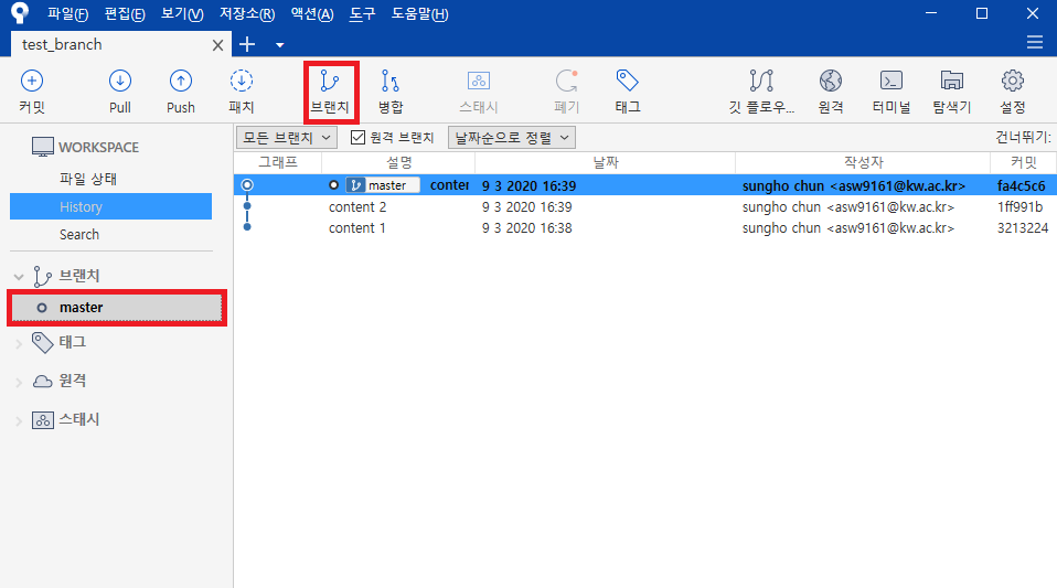 위 사진처럼 왼쪽탭에 master를 더블클릭하고 위에 '브랜치'를 눌러서 브랜치를 해보자