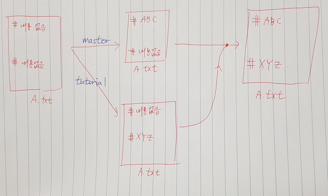 각각의 브랜치는 한 파일 안에서 각기 다른 부분을 수정하였고, 이 들을 병합하면 어떻게 될까?
