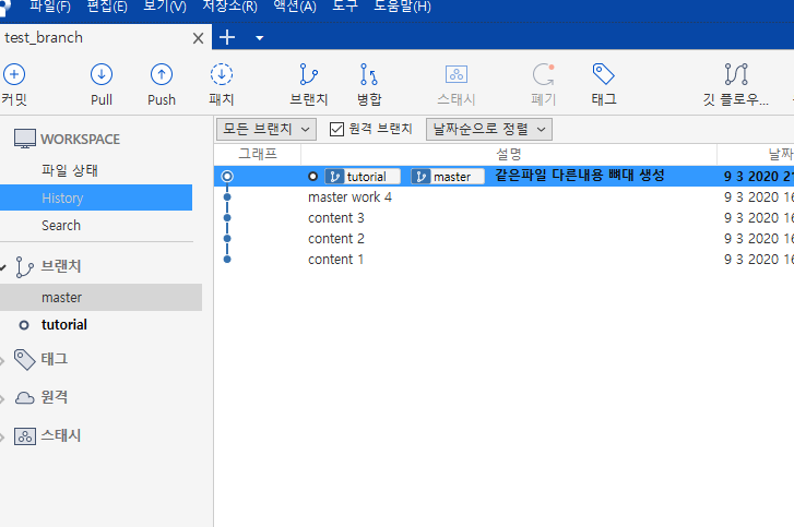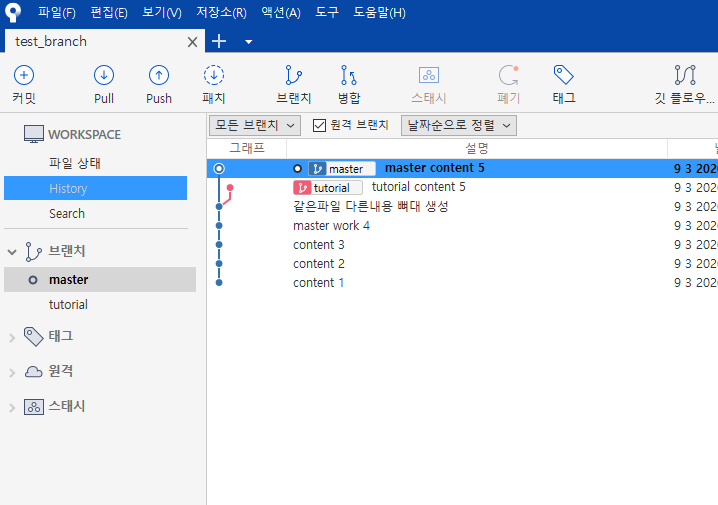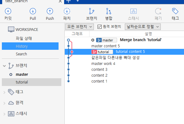 마스터 브랜치와 tutorial브랜치는 각각 다음과 같이 바꿨다.