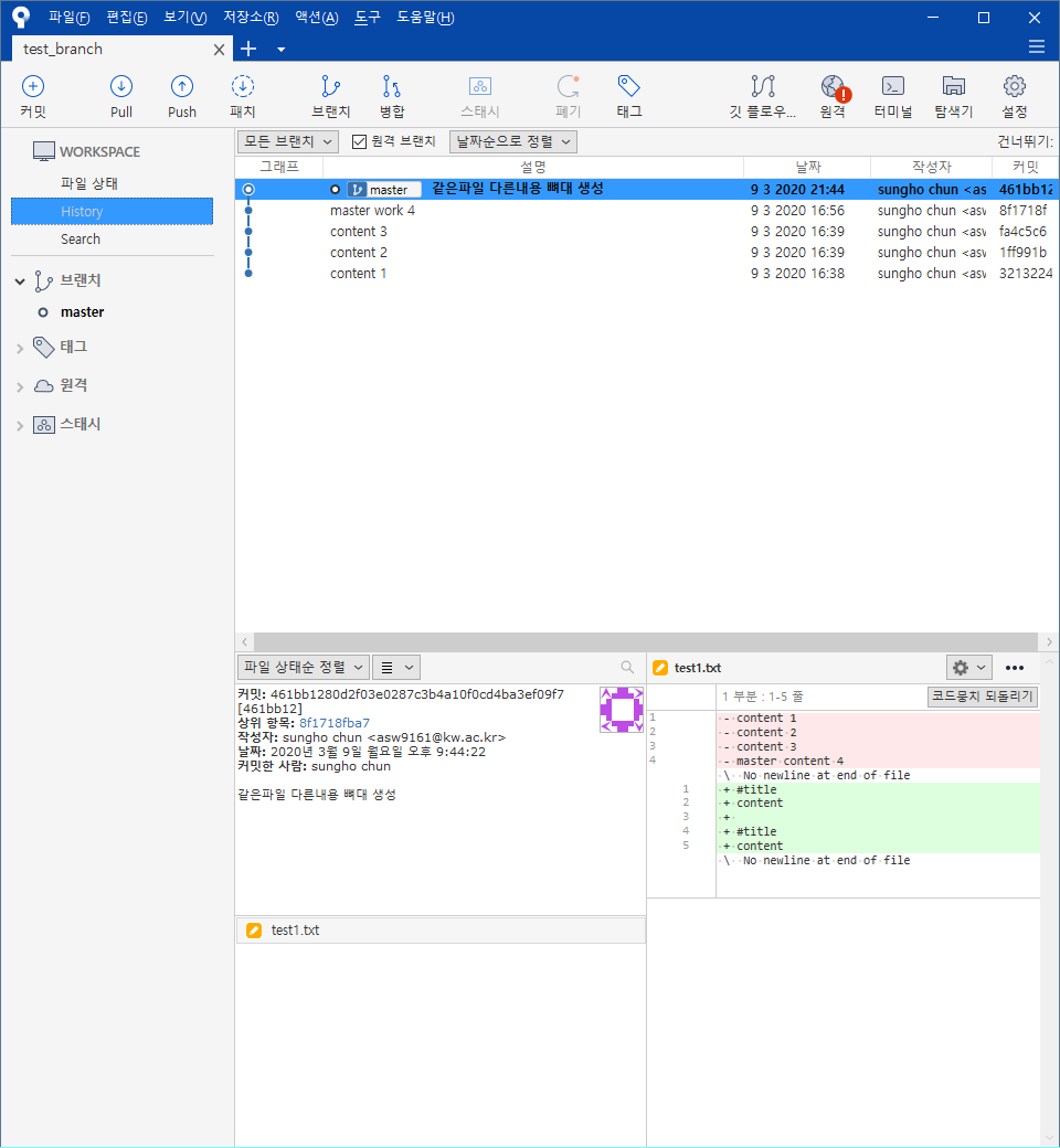 같은 이름의 파일을 각각의 브랜치에서 나누어 작업을 했다.
