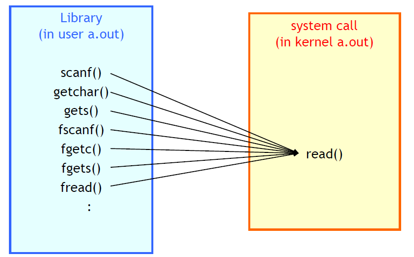 예) printf() : library함수 ---> write() : system call 호출