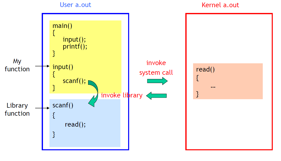 library의 많은 함수들은 실행되기 위해서 System call을 호출한다. 그리고 System call은 Kernel의 일부이다.