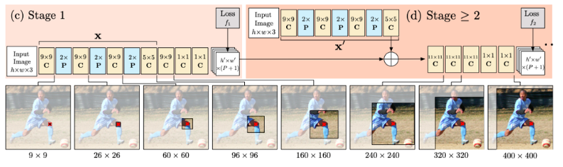 classifiers of stages t(t >= 2)는 이전 단계의 belief maps에 convolution을 적용하고 input으로넣는다. 이 메커니즘은 joints간의 상관관계를 더 잘 이해하게 하고 better predictions에 기여한다. 예를 들어 오른쪽 어깨가 우상단에 있으면 오른쪽 팔뚝이 좌하단에 있을 가능성이 줄어들기 때문에 이를 고려한다는 말이다.
