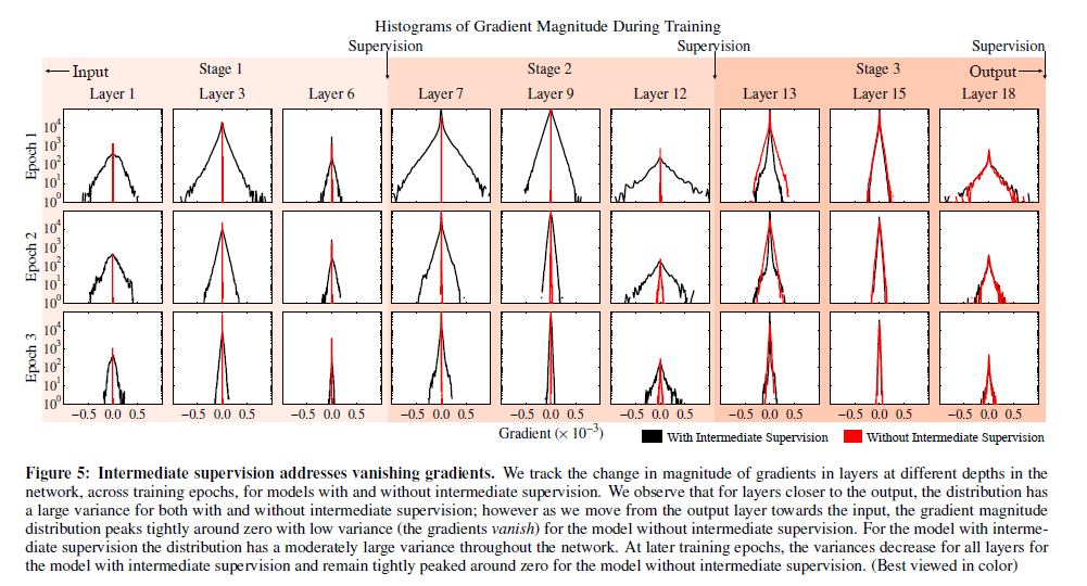 위 사진에는 빨간색 그래프와 검은색 그래프가 같이 있는데, 빨간색 그래프의 폭은 매우 좁거나 0에 가까운 것을 볼 수 있다. 이는 기울기 소멸문제로 학습이 중단된 것을 의미하고, 검은색 그래프처럼 폭이 꽤 넓은것이 기울기가 안정적으로 소멸하는 것으로 제대로 학습이 된것을 의미한다. 위 사진에서도 언급하듯이 빨간색 그래프가 중간관리자(intermediate supervision)이 존재하지 않는 모델이고, 검은색이 존재하는 모델.