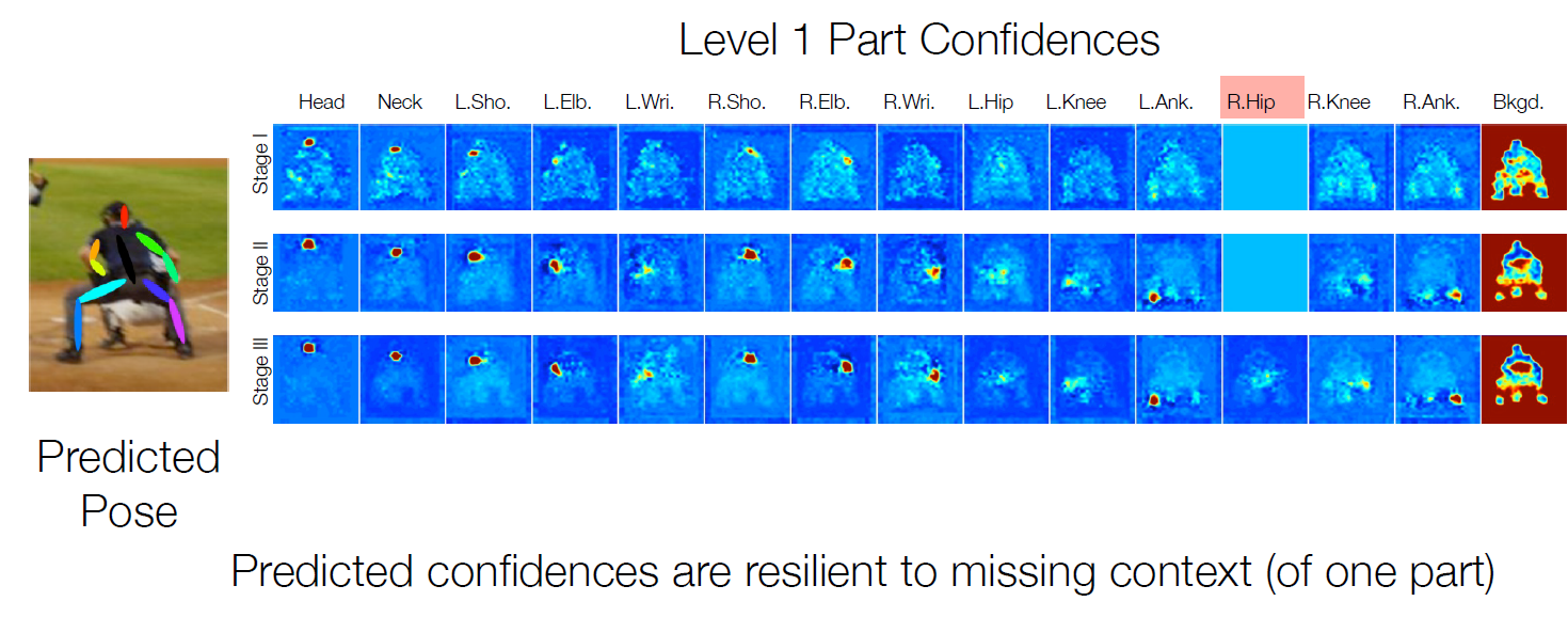 또한 본 논문에서 제시한 방법에 따르면 망을 거치고 나와서 얻은 confidence map은 context의 일부분 누락이 있더라도 꽤 성능이 잘 나온다고 한다. 아래 사진을 참고하자.