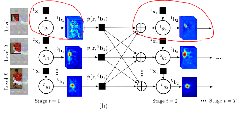 b는 confidence map을 의미하고 t는 stage의 번호를 말한다. b는 predictor의 output이다.