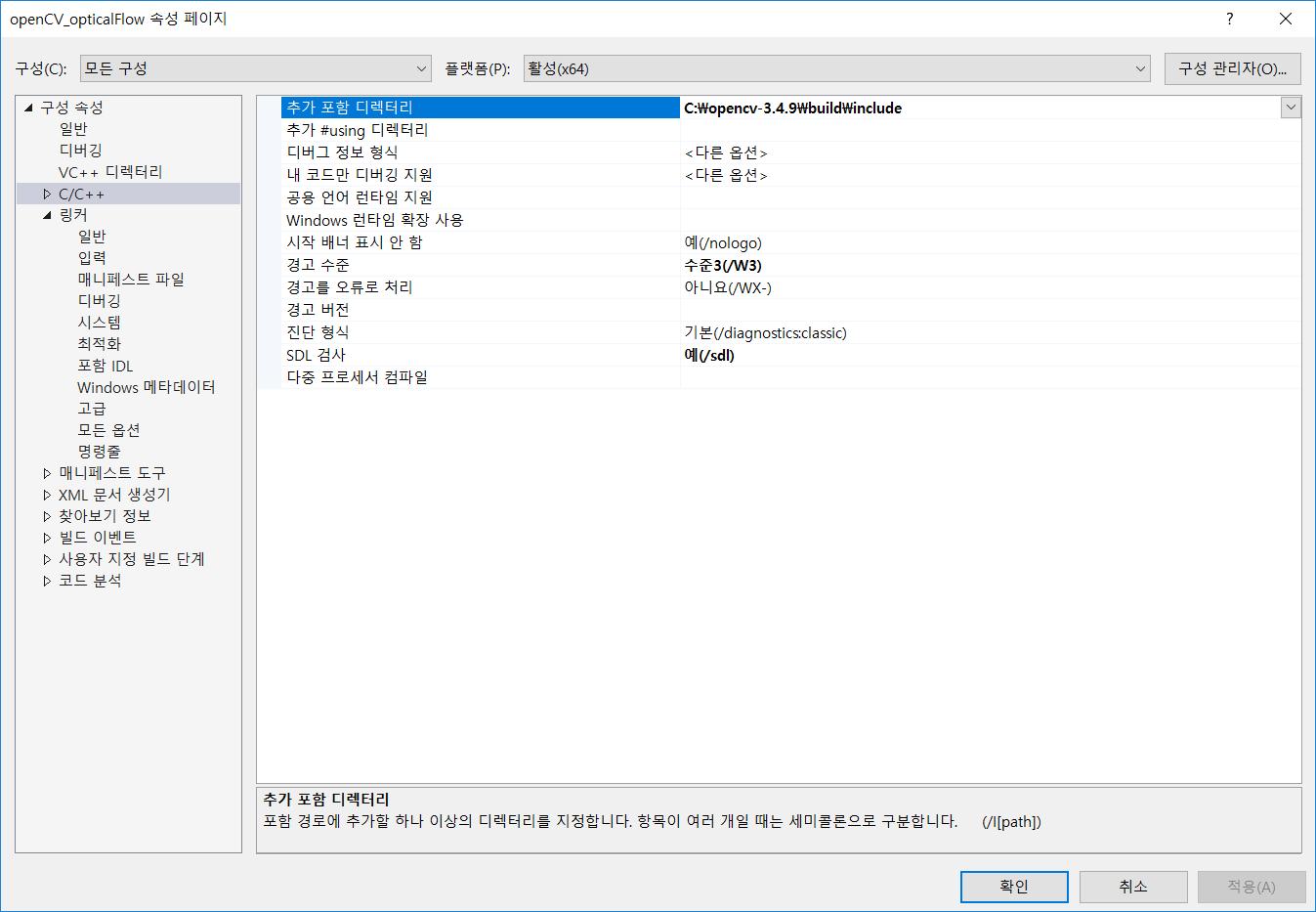 이렇게 등록하면 opencv, 소켓통신 둘다 환경설정이 한번에 완료된다.