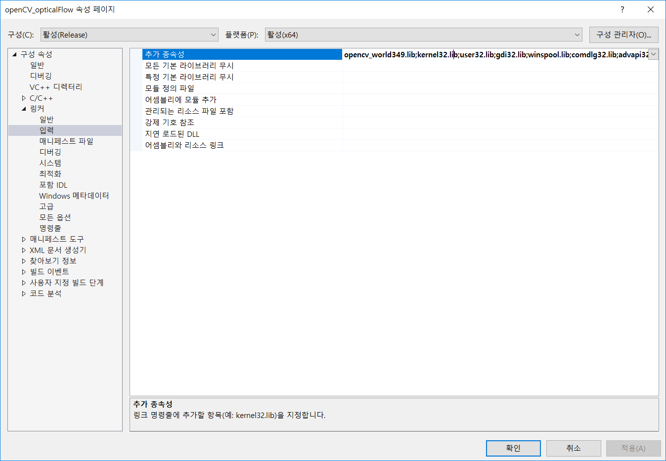 링커 -> 입력 -> 추가종속성에 라이브러리 이름을 추가