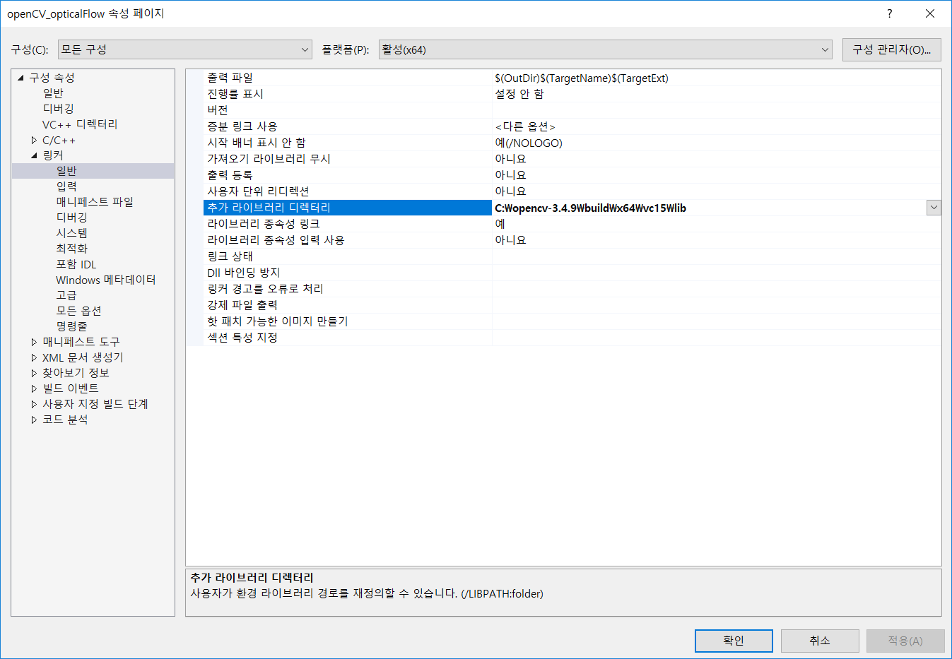링커 -> 일반 -> 추가 라이브러리 디렉터리 -> opencv lib파일 위치를 입력