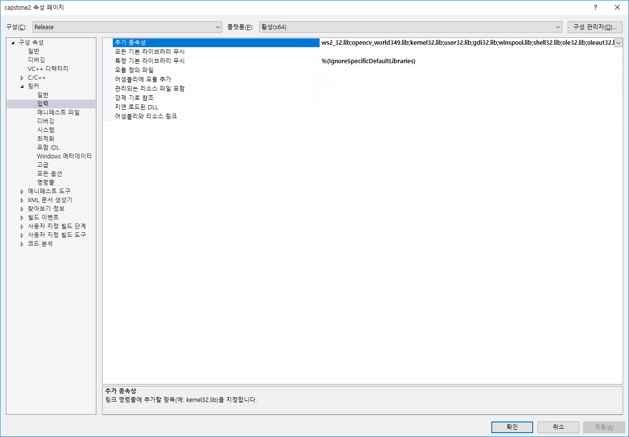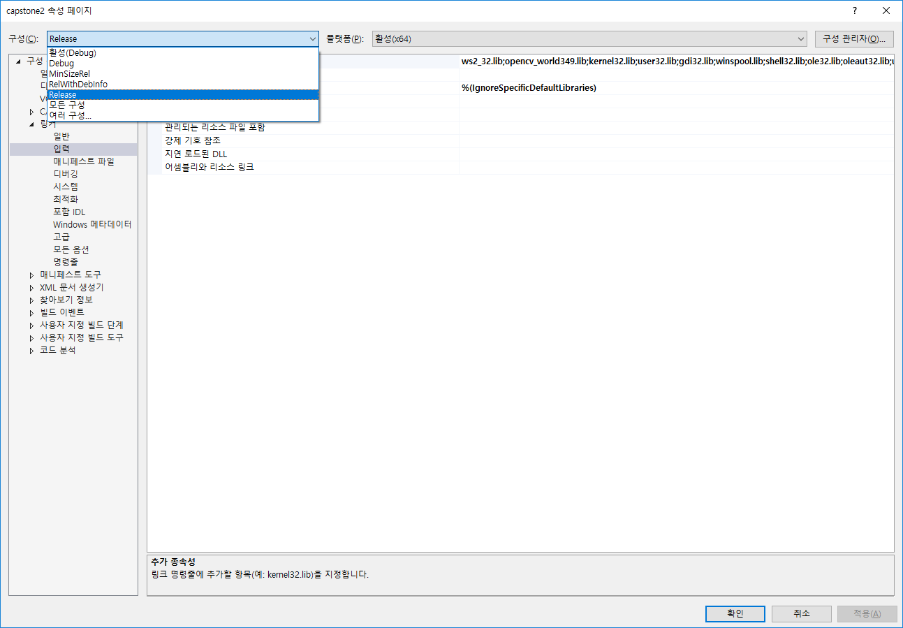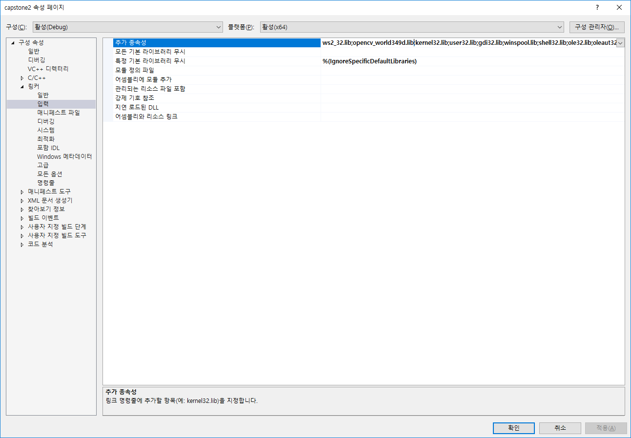 여기서 ws2_32.lib는 소켓통신용 라이브러리이고 뒤에는 당연히 opencv 디버깅용 라이브러리이다.