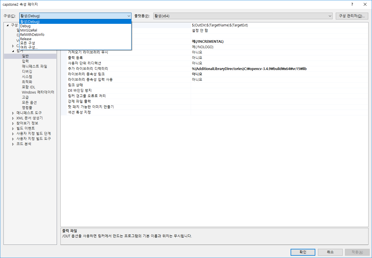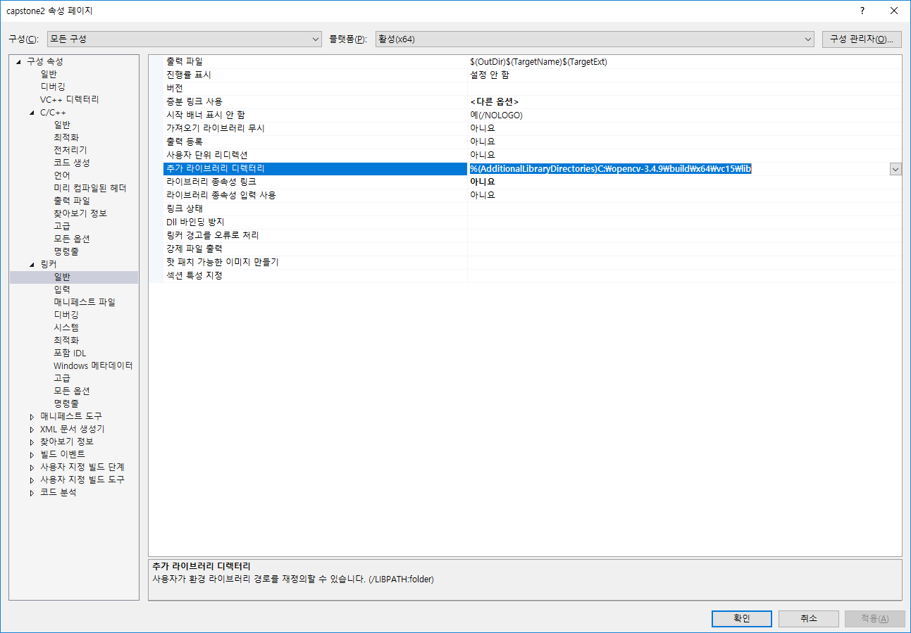 링커 - 일반 - 추가라이브러리 디렉터리 - %(AdditionalLibraryDirectories)C:\opencv-3.4.9\build\x64\vc15\lib