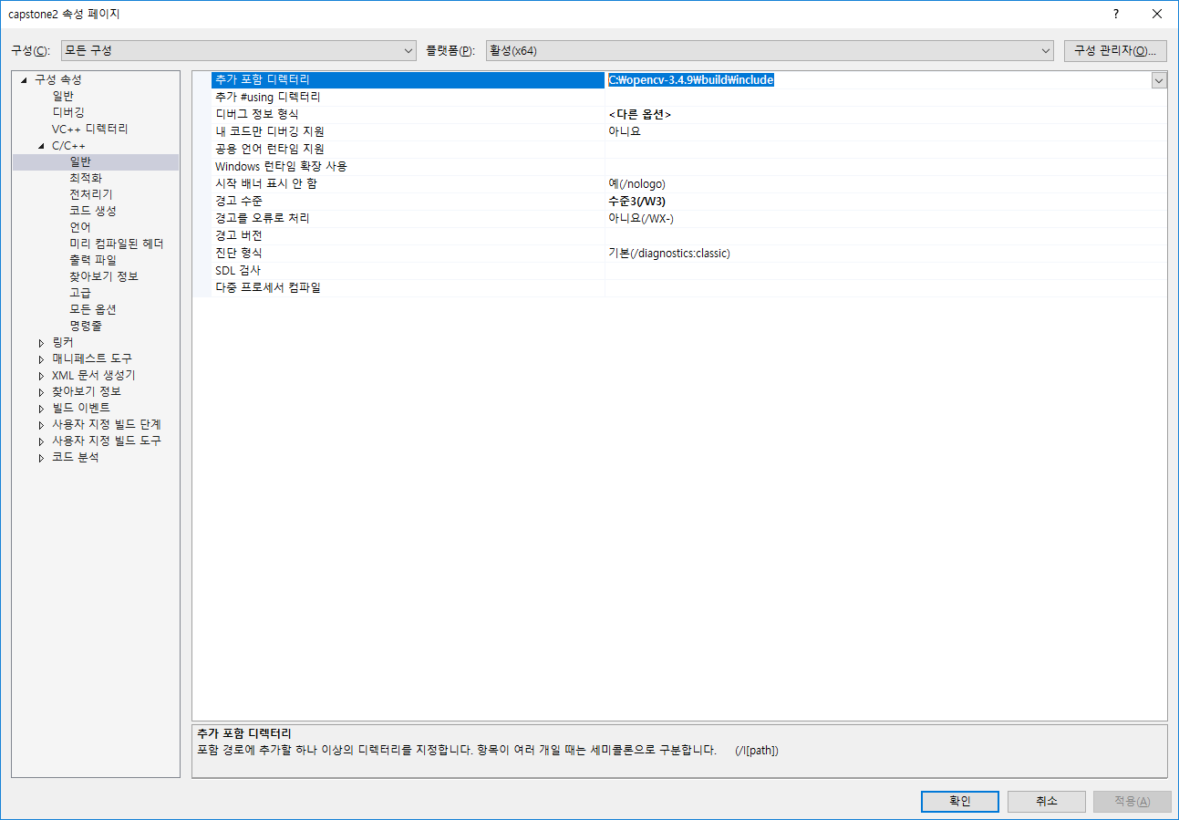 C/C++ - 일반 - 추가포함디렉터리 - C:\opencv-3.4.9\build\include