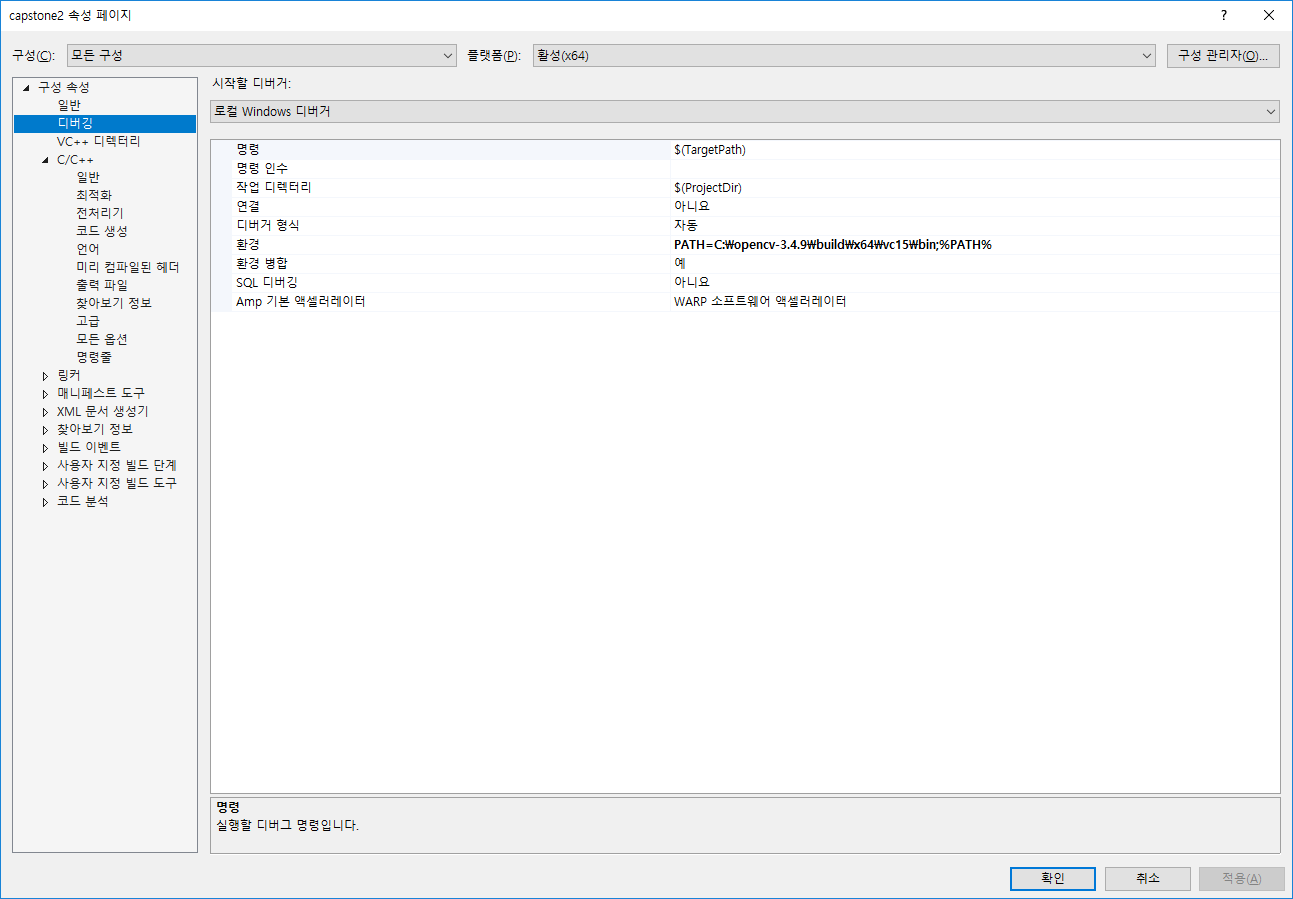 디버깅 - 환경 : PATH=C:\opencv-3.4.9\build\x64\vc15\bin;%PATH%
